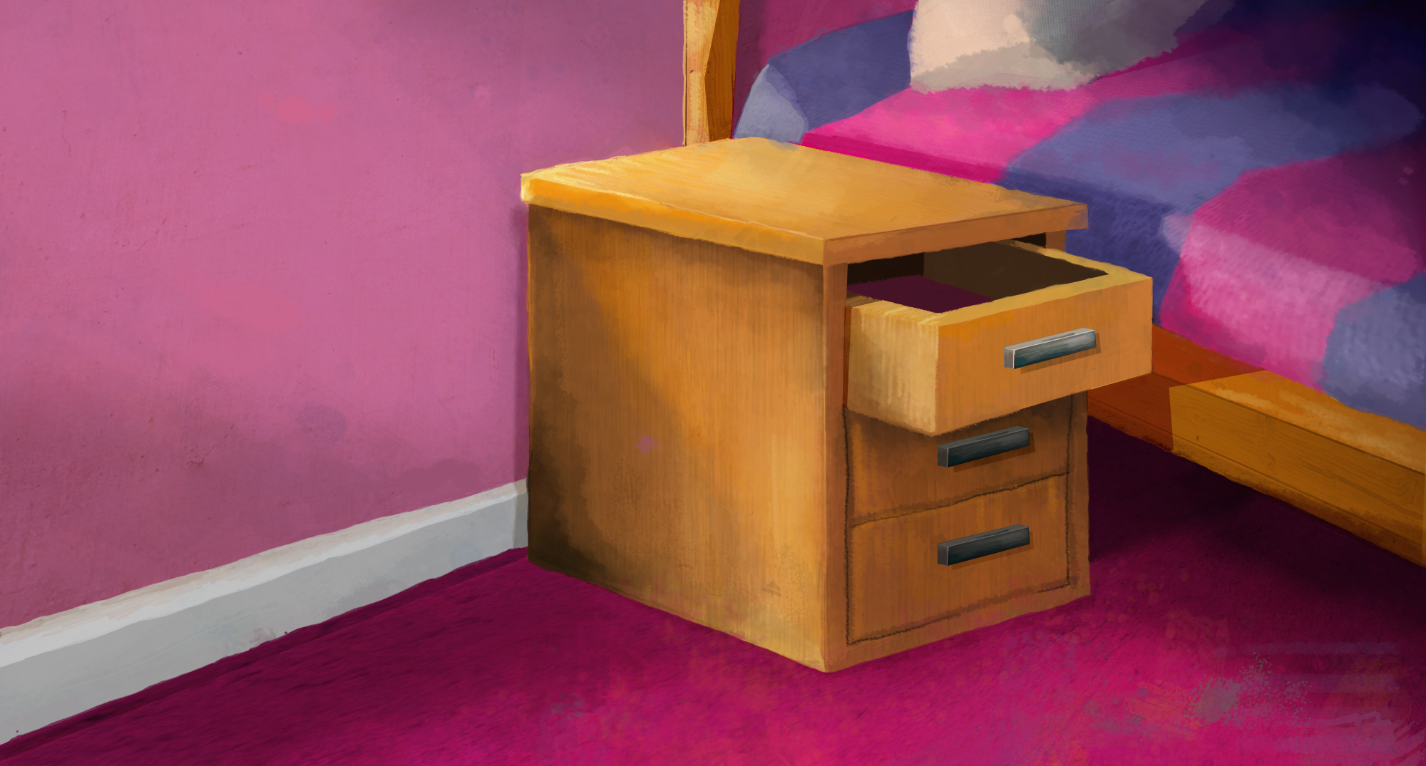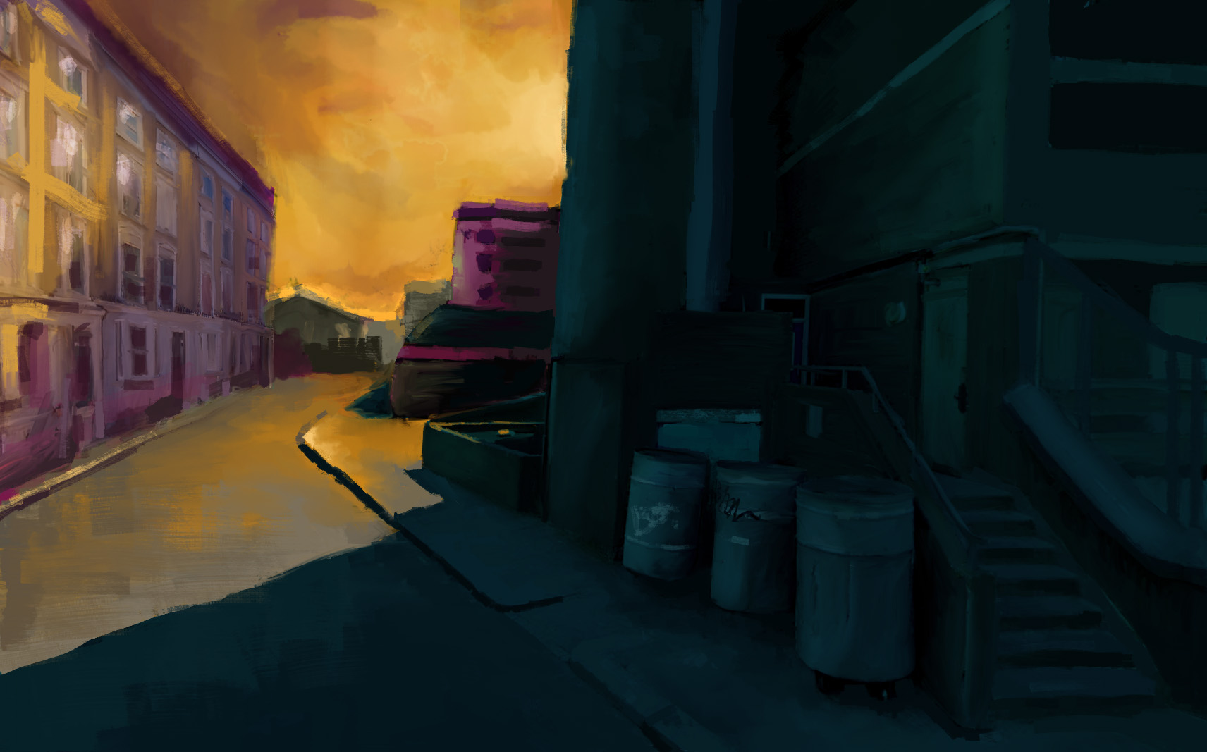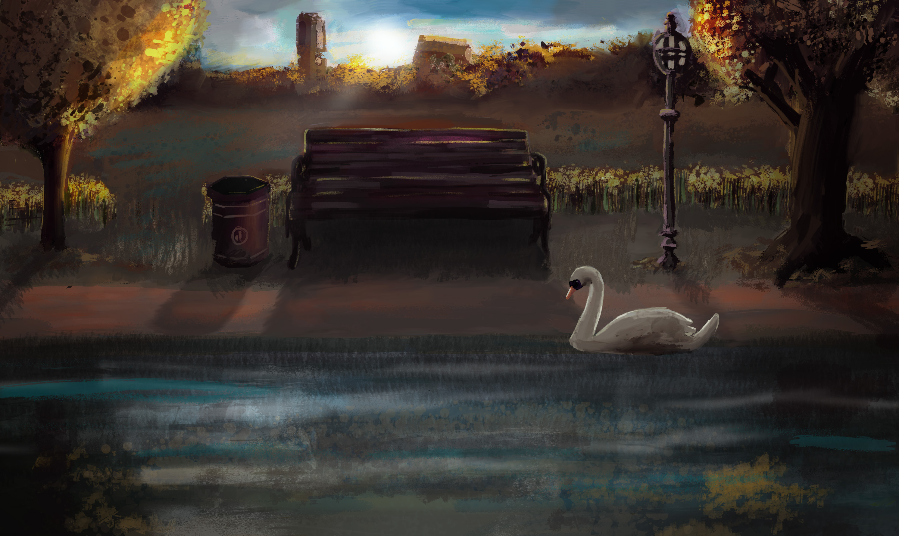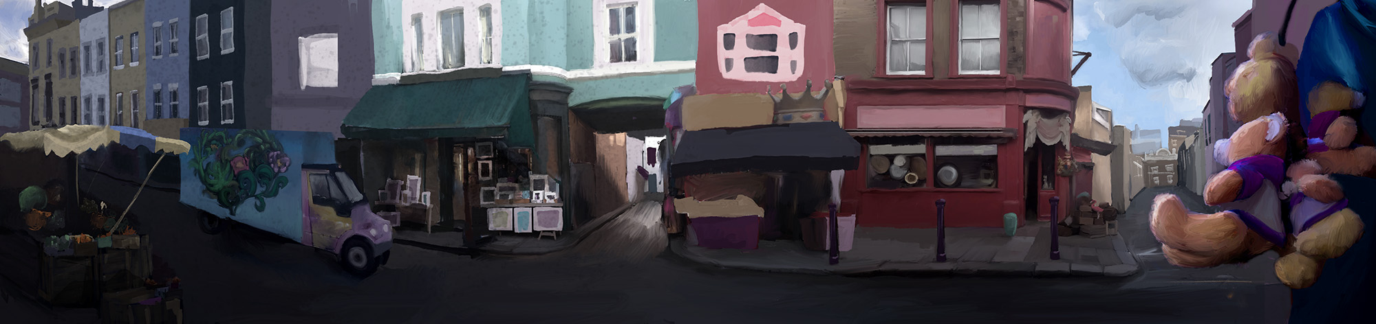 For the style of the background artwork, John crafted it to resemble hand-painted illustration. This was so that the brush strokes can bring some vitality to somber stories and a child-like quality. It was set in autumn, a subtle metaphor for the ending of love and the use of strong light to imply there is still hope. All the locations in the animation were taken from places within the two London boroughs. The colour pallet was subtly working with the brand colours of the children’s departments.